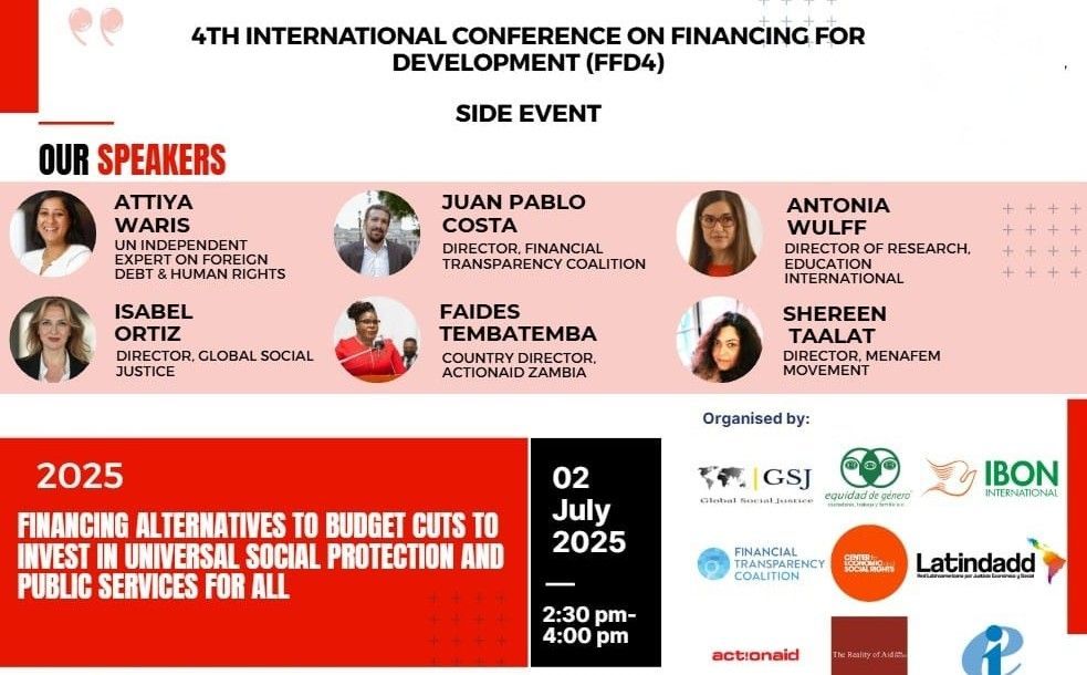 At this UN FfD4 high level side event members of civil society, academics, and experts highlighted that current financing frameworks deepen inequalities by prioritizing debt repayment, austerity, financing of wars and defunding of social protection, as well as private finance over public goods, thereby worsening women’s unpaid care burdens and undermining decent work -calling for forward-looking progressive policies for gender justice.